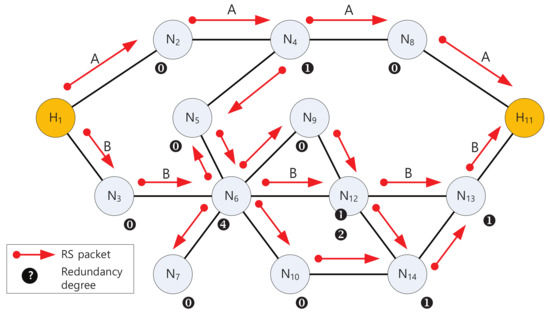 where denotes the set of routes from hub to hub , and denotes the number of synchronized neighbor nodes of the node n in path P. The proposed control chooses the path with the highest sum of the degree of redundancy of the intermediate nodes included in the path. However, the degree of redundancy of the paths can be affected by certain links with a very high degree of redundancy. To solve this problem, we limit the degree of redundancy of each link to a specific upper bound, . In the figure, the first and second path have one and seven degrees of redundancy, respectively. Therefore, the destination hub selects the second path as the best path. In this procedure, every node that receives the RS packet follows Algorithm 3.