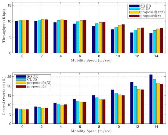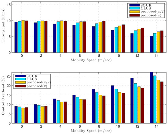 Figure 6 shows the performance when the network size was 1 km × 1 km. Figure 6 compares the throughput, showing how many data packets could be sent successfully from the source to the destination. The proposed control exploits redundant paths as backup links or relayed cooperative links. Backup links increase the throughput by reducing the time for link recovery, and relayed cooperative links can increase throughput by sending the same information at the same time to enhance the signal-to-noise ratio. In contrast, in SOUR and CLUS, information is sent along a single path based on a noncooperative mode. Comparing SOUR and CLUS, the proposed control provided and enhanced throughput. Figure 6 also compares the control packet overhead to successfully deliver data traffic from the source to the destination. Control packet overhead is strongly related to transmission-path management tasks such as finding new routes and recovering from link failures. The proposed approach reduced the control packets using predetermined stable hub paths and redundant local paths, minimizing frequent route discovery processes. It also used simpler maintenance messages—i.e., HelloHub and ByeHub messages. In contrast, in SOUR, the intermediate node started the source routing whenever there was a link failure. Frequent route-retrieval processes that rely on network-wide flooding mechanisms increase control overhead. The CLUS had higher overhead because of its complex cluster and gateway selection mechanism and various cluster head and gateway messages. Comparing SOUR and CLUS, the proposed control gave and lower overhead. On the other hand, in a low mobility environment, the proposed () gave a higher performance than the proposed (). However, as the movement speed increased, the proposed () gave a better performance than the proposed (), because the number of synchronized nodes is more important than the synchronization strength in the slow movement, and the synchronization strength is more important than the number of synchronized nodes in the fast movement. The larger is , the greater is the number of synchronized nodes, but the weaker is the synchronization. Figure 7 shows the performance when the network size was 2 km × 2 km. Comparing SOUR and CLUS, the proposed control gave and enhanced throughput, and and reduced overhead. From these simulations, we can see that the performance gain increased as the network size grew larger.