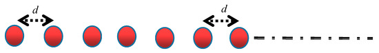 In fact, the movement of the bubbles under the ultrasonic field is a forced vibration. The main parameters that affect the forced vibration of the bubbles include resonance frequency, ultrasonic frequency, and amplitude. In order to investigate the relationship between the resonance frequency of the cavitation bubble and the number of bubbles, the initial radius of the bubble, and the distance between bubbles, Equation (1) has been used as a linear simplification. Assuming that the distance between bubbles in a columnar group is and that all bubbles have the same initial radius, the bubble we investigate here is the first one. At this time, the distance between any bubble and the first bubble can be expressed as , as shown in Figure 1.