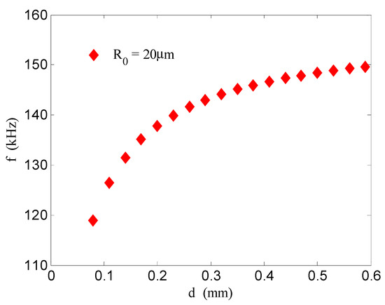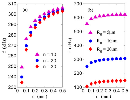 From Equation (9) it can be seen that the resonance frequency of the bubbles in a columnar bubble group is related to the distance between the bubbles, the number of bubbles in the bubble group, and the initial radius of the bubbles. Hence, we have been able to numerically calculate the relationship between the distance between the bubbles, the number of bubbles, and the resonance frequency of the bubbles. From Equation (9) we obtain Figure 2, Figure 3 and Figure 4, where the values of the parameters are, respectively, , , , , and .