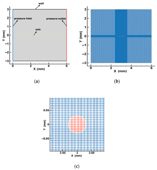 Simulation domain and meshing: (a,b) show the calculation of the domain and the linear bubble in the liquid and (c) shows the third bubble and mesh in the domain.