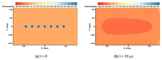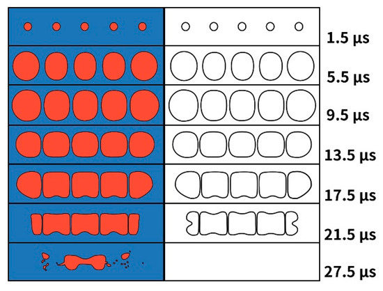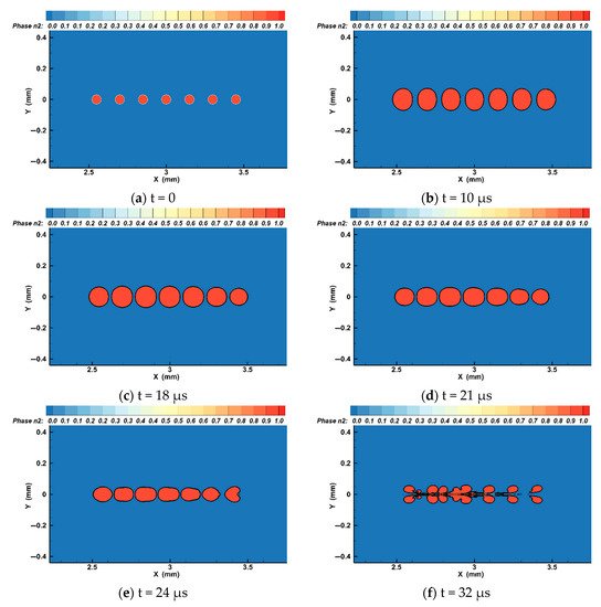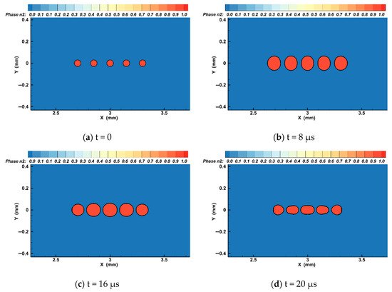 It has been pointed out that under a weak coupling effect between bubbles, bubbles maintain the shape of the hemisphere most of the time without contact and fusion, but, when the bubbles collapse, they form an interfacing jet [12]. We simulated the growth and collapse process of bubbles for five and seven bubbles set in a line using Fluent software with an initial radius of 30 and a distance of 200 between bubbles. It can be found from Equation (9) that when the number of bubbles is five the resonance frequency of the bubbles is 89.8 and that when the number of bubbles is seven the resonance frequency of the bubbles is 88.4 . Using a volume of fluid (VOF) 2D axisymmetric analysis has the advantage of easy realization, small computational complexity, and high precision, and traces the volume of fluid in the grid, not the motion of the fluid particles [37]. For the simulation domain, shown in Figure 5, the calculation field is , the number of cells is 253,000, the number of nodes is 254,331, and the calculation step is 0.01. The liquid medium is water and the gas inside the bubble is nitrogen. In the process of simulation and calculation, the ultrasonic field is driven from the left side, for which — is the amplitude of the ultrasonic pressure and is the ultrasonic frequency. The right side is the free interface and the outlet pressure is the hydrostatic pressure, which is an atmospheric pressure. The ultrasonic frequency is 26 , which is smaller than the resonance frequency of the bubble, and the ultrasonic pressure amplitude is 1.2 bar. Then we obtained Figure 6, Figure 7, Figure 8 and Figure 9.