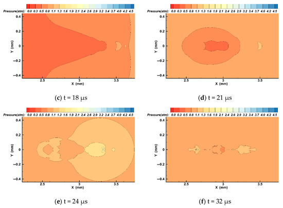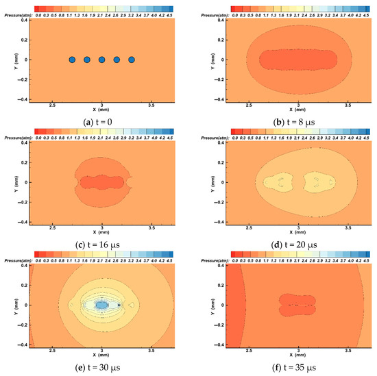 Figure 7 and Figure 9 show that the pressure inside the bubbles decreases sharply during bubble expansion and that when the bubble expands to the maximum volume, the pressure inside the bubble is only 0.41 bar; in the period of bubble shrinkage and collapse, the pressure inside the bubble rises sharply. When the bubble collapses, the pressure inside the bubble reaches its maximum value of about 1.82 bar. After the bubble collapses in Figure 9f, the pressure inside and outside the bubble tends to be almost the same. Due to the micro-jet generated by the bubble collapse, the pressure on the jet line is significantly greater than in other locations. In addition, on account of the mutual coupling between the bubbles, the resonance frequency of the bubbles is reduced, and under the same acoustic parameters a large number of bubbles collapse sooner and more easily. The pressure inside the bubble also changes more sharply.