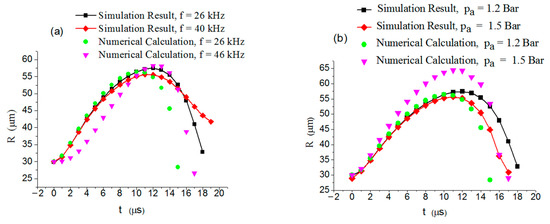 In order to verify the reliability of the simulation results, the relationship between the first bubble radius and time evolution in the simulation results of Fluent was obtained using the boundary tracking method, and the tracking results were compared with the numerical calculation results of bubble motion obtained using Equation (1). The comparison results are shown in Figure 11. The initial radius of the bubbles was 30 and the distance between bubbles was 150 . Figure 11a shows the evolution curve of the bubble radius with time under different ultrasonic frequencies. Figure 11b shows the evolution curve of the bubble radius under different driving ultrasonic intensities. In Figure 11, the lines and points are obtained by Fluent software simulation, and the discrete points are obtained by numerical solution of Equation (1).