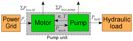 The mechanical power Pmech of the electric motor is transmitted to the pump, and therefore, in the absence of intermediate mechanical gears, is equal to the input mechanical power of the pump. In the pump, the mechanical power Pmech is converted to the hydraulic power Phydr. The difference between Pmech and Phydr is the total loss ΣPloss.pump in the pump [8]: