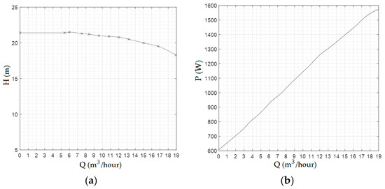 (a) Q-H curve of the pump. (b) Dependence of the pump power on water flow [17].