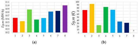 In order to correlate the cost of electricity consumed with using various electric motors in pump units, the differences between the costs of electricity required by the electric motor with the highest energy consumption (IE3 class motor No. 8 manufactured by ABB, Zürich, Switzerland) and the other seven motors were calculated according to Equation (9). The calculation results according to Equations (4)–(9) are summarized in Table 4 and Table 5, and are also shown in Figure 5 and Figure 6.