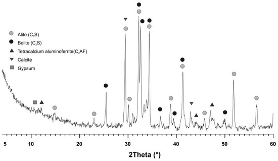 Mineralogical analysis of the cement was conducted with X-ray diffractions (XRD) using a Bruker D8 Advance diffractometer (Bruker Española S.A., Madrid, Spain). The spectrum was registered with stepping intervals from 4° to 60° at 0.05° in the Ө-Ө mode (X-ray tube power: 40 kV and 30 mA). The XRD showed that the cement is composed of alite (C3S), belite (C2S), tetracalciumaluminoferrite (C4AF), calcite, and gypsum (see Figure 1). Moreover, the chemical composition of the cement was studied with X-ray fluorescence (XRF)with a Philips magic pro spectrometer (Philips Ibérica, Madrid, Spain);the main elements are shown in Table 1.