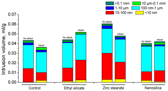 - After the sulphuric acid attack, the control mortars and mortars with zinc stearate showed a less-refined microstructure with a predominance of pores of higher sizes. On the contrary, pore structure was more refined in mortars treated with ethyl silicate coating exposed to the attack. Mortars with nanosilica exhibited limited changes in pore size distribution after the acid exposure, compared to the optimal condition.
