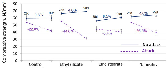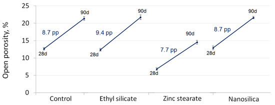 Figure 5 shows the effect of the sulphuric acid attack on the open porosity of mortars in the time period between 28 days and 90 days of exposure. It was observed that all the mortars increased porosity at 90 days with respect to porosity at 28 days due to the acid attack. The ethyl silicate mortar was the most affected with an increase in porosity of 9.4 percentage points. The zinc stearate mortar was the least affected with an increment of 7.7 points. These results are coherent with previous studies where it was observed that mortars exposed to acid attacks suffered mass (Figure 6a) and strength losses (Figure 6b) due to the increase in porosity and permeability [47].