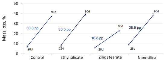 The results of mass loss due to the sulphuric acid attack are shown in Figure 4. All the cases showed substantial mass loss. The largest variation occurred for the ethyl silicate mortar with an increase of 30.5 percentage points (pp) (increased from 8.6% at 28 days to 39.2% at 90 days), and the zinc stearate mortar was the least affected with an increase in mass loss of 16.8 points. These results are consistent with those obtained in other studies, where cementitious materials were seen to decrease mass with increase in exposure time [3,10,28].