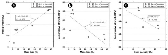 Figure 6 shows the correlation between mass loss, open porosity, and compressive strength. The good correlation between mass loss and open porosity (Figure 6a) indicates that the higher the open porosity of the mortars, the higher is the mass loss. As can be observed in Figure 6b,c, compressive strength is directly related to the deterioration of the mortar, which also depends on the porosity of the cement paste.