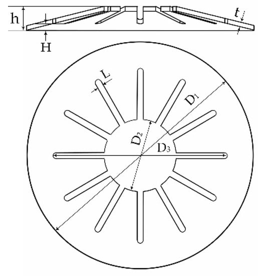 The disc springs for TRUMs should be specially designed. Here, the slotted disc spring is selected, which is usually applied in situations where the axial dimension is limited and the outer diameter is large. Based on the experimental experience, the best performance of the PMR40 motor is generally obtained at the pre-loading force of 135 ± 5 N. Therefore, when designing a slotted disc spring, it is desirable that the zero-stiffness section occurs at the load of about 135 N and the span of it is expected to be longer, which plays an important role in stabilizing the TRUM’s pre-pressure and performance. The calculation formula for load P of slotted disc spring [16] is shown in Equation (1).