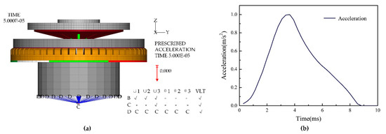 Constraints and load settings of the model: (a) constraints setting; (b) the high-impact acceleration loading curve.
