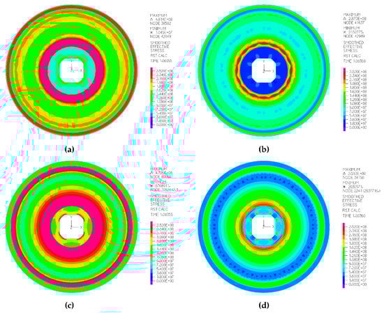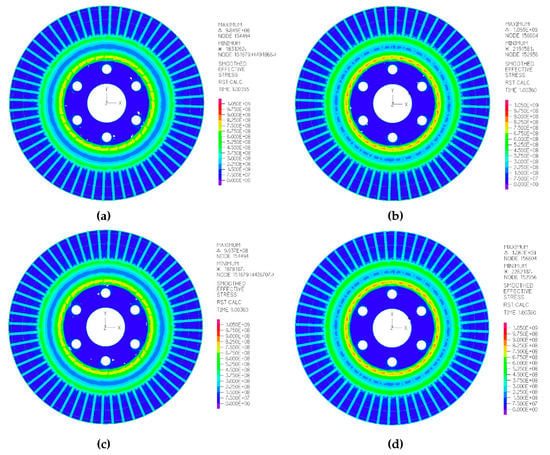 Stress-cloud diagrams of the rotors at the moment that maximum stress occurs: (a) TRUM-1; (b) TRUM-2; (c) TRUM-3; (d) TRUM-4.