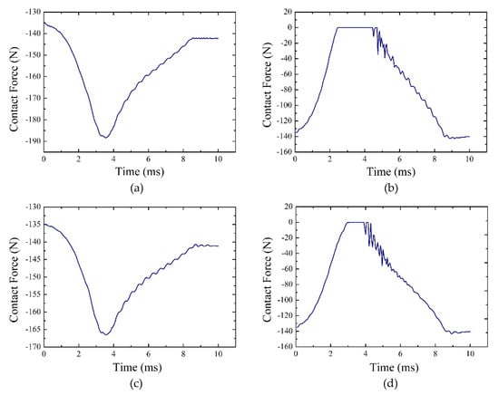 Contact surface force change during the impact process: (a) TRUM-1; (b) TRUM-2; (c) TRUM-3; (d) TRUM-4.