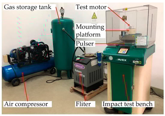 The high-impact test with acceleration of 10,000 g to the TRUMs is done by using the pneumatic impact test platform (model: SM-110-MP) produced by Transmission Science and Technology Co., Limited, Huntsville, AL, USA. The maximum acceleration that can be achieved by this set is 30,000 g. The pulse width is 0.012–100 ms. As shown in Figure 12, the impact test bench system mainly includes: an impact test bench, an air compressor, a gas storage tank, a filter and a control panel, etc. In addition, there is an electromagnetic switch, a piston and cylinder, an acceleration sensor, a piston and external mounting in the internal design which are connected to the mounting platform.