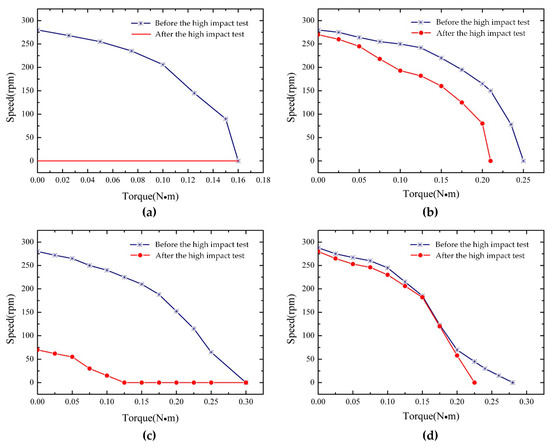 Before the impact test, the motor is fixed on the mounting platform, and the maximum acceleration of 10,000 g is set through the control panel on the impact-test platform. The acceleration is measured by an acceleration sensor inside the test platform and feedback control is designed to ensure the acceleration value. During the impact test, compressed air is introduced to the underside of the piston, raising the platform to a pre-selected height. Once this is achieved, the brake is activated, the lift air is exhausted and compressed air is introduced into the other side of the piston. When the required inflation pressure is reached, the brake device is turned off, the platform is driven to fall rapidly by the inflation pressure, hitting the pulse generator mounted on the anvil, generating a huge impact force and the high-impact test is finished. The impact test results of four motors are reflected by the deformation test and performance test of the motors below.