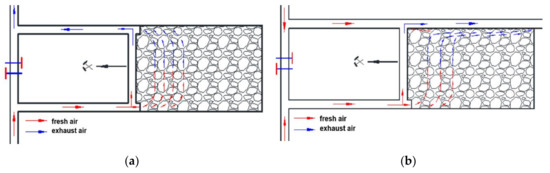 The flow of air through goaves with caving results from its migration from the area of the longwall to which a stream of ventilation air is supplied. This stream is supplied to longwalls for their ventilation. There are several longwall ventilation systems, with the most common being the U-type ventilation system from the borders and the Y-type ventilation system [16] (Figure 1). Analysing both of these systems, it is possible to see a clear difference in the flow of air through the exploited headings.