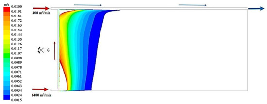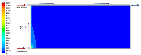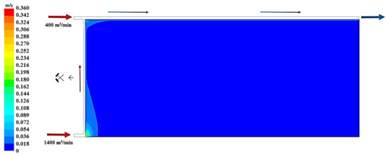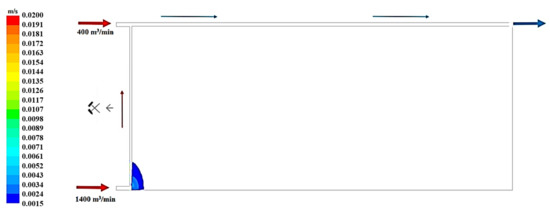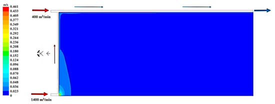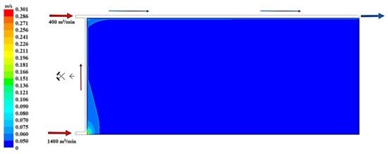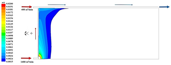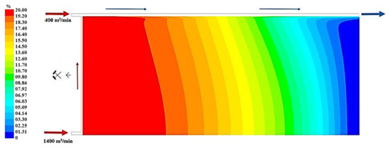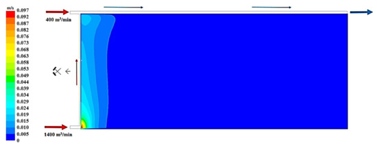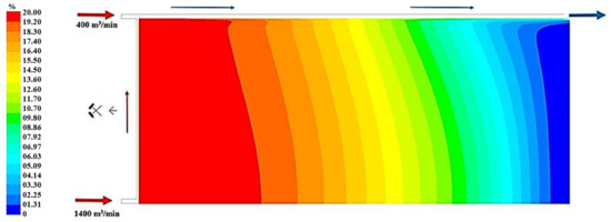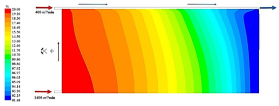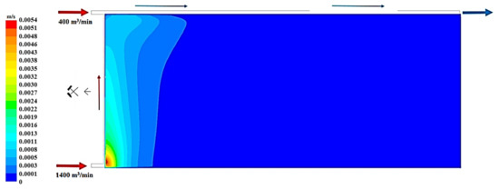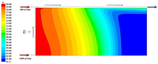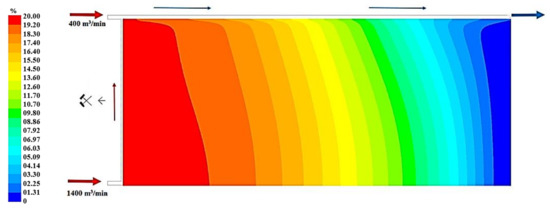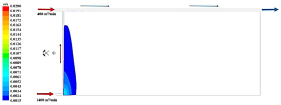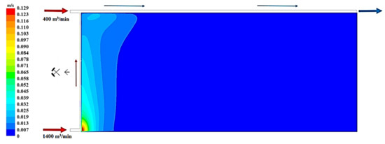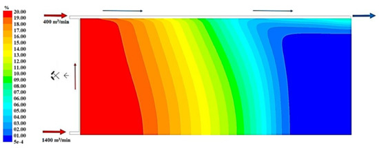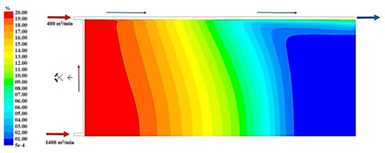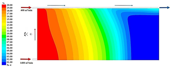 Figure 19, Figure 20 and Figure 21 present, respectively, the distributions of the air speed and the dangerous speed due to the risk of endogenous fires, as well as the oxygen concentration levels in the goaves with caving at a distance of 0.5 m from the floor of the exploited seam.