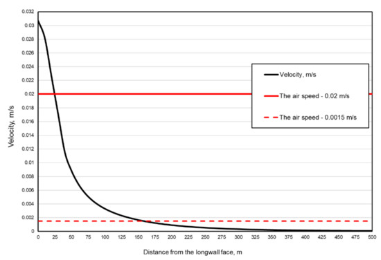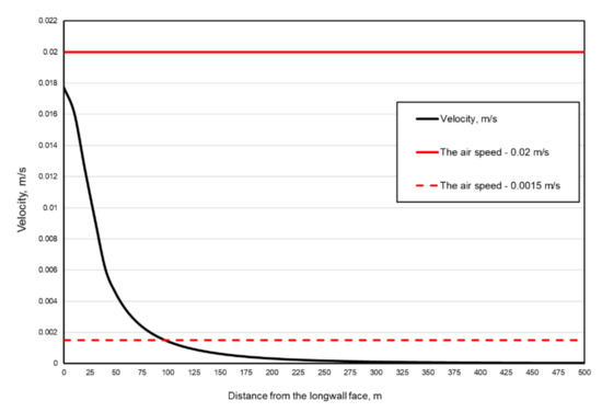 In the paper by Cheng et al., this value was assumed to range from 0.004 to 0.0016 m/s [21]. Chumak et al. [22], on the other hand, assumed that the critical speed value ranges from 0.015 to 0.0017 m/s, whereas Szlązak reported that this value is between 0.015 and 0.0015 m/s [23]. On the other hand, Wang et al. [24] indicated that this value ranges from 0.001 to 0.02 m/s. The speed ranges indicated are quite extensive. Therefore, the present paper assumes that this speed ranges from 0.02 m/s to 0.0015 m/s.