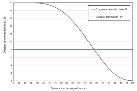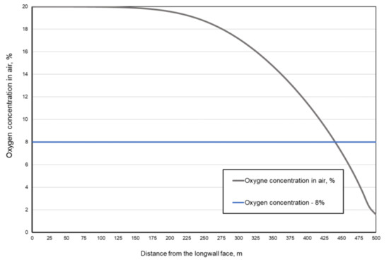 In the case of the oxygen concentration in the air flowing through goaves with caving, it has been demonstrated that the lower limit for self-combustion of coal is 8%. The results of the tests carried out by Buchwald [25] indicate that no spontaneous combustion of coal occurs below this value due to the insufficient concentration of oxygen.
