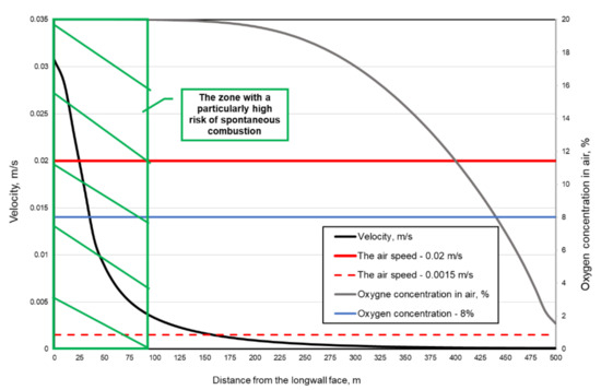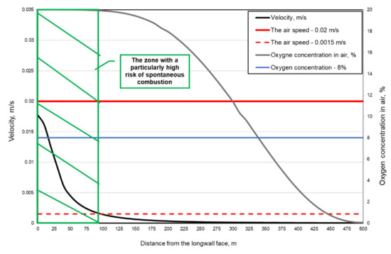 Behind the zone of a particularly high risk of spontaneous combustion, at a distance of over 160.0 m from the longwall front to approximately 460.0 m, there forms a zone with insufficient air speed, yet with sufficient oxygen concentration in the air (due to the risk of spontaneous combustion).