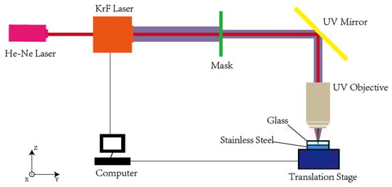 Microchannel fabrication for biomedical or chemical analysis is an emerging technique as a fast, low-consumption, miniaturized tool in the biochemistry, analytical chemistry, microsensor, and microtechnology fields [1,2,3,4]. As a typical biologically friendly material, fused quartz glass is widely used in microfluidics owing to various advantages such as low cost, high optical transparency, and structural stability [5,6,7]. Thus, the quartz glass microchannel manufacturing technique attracted increasing attention, especially ultraviolet (UV) laser ablation using excimer lasers (157, 193, and 248 nm) or higher-order harmonics of neodymium-doped yttrium aluminum garnet (Nd: YAG) lasers (266 and 355 nm), which are commercially available and provide large single-photon energy, great flexibility, and high manufacturing precision [8,9]. However, fused quartz glass microchannel fabrication by UV laser is still challenging due to the brittle nature of glass and the wide band gap (9 eV) of fused quartz. Good quality of the treatment surface and sufficient etching depth are difficult to approach using traditional direct laser etching [10,11,12,13]. To solve these problems, great effort was exerted in both the theoretical and experimental study of UV laser ablation.