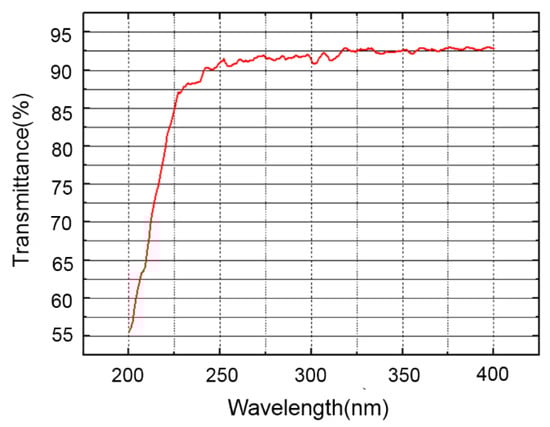 A 1 mm thick UV transparent quartz glass was used in this experiment, and the content of SiO2 was no less than 99.96%. We measured the transmittance spectrum of the fused quartz glass in the UV range prior to ablation using a spectrophotometer. As can be seen in Figure 2, such glass has a good transmittance window in the UV range, and the transmittance is greater than 92% at 248 nm. The 8% transmission loss is due to reflection at the quartz layer surface, such that the 248 nm laser beam is hardly absorbed by the substrates [21]. A 304-type stainless-steel plate (20 mm × 20 mm × 10 mm) was chosen as the target for plasma vaporization generation. The metal target was kept in contact with the rear surface of the fused quartz glass so that the glass could be etched directly by the high-temperature plasma. For preparation, both the glass sample and the stainless-steel target were ultrasonically cleaned in ethanol for 10 min to remove the oxide on the surface before the experiment.