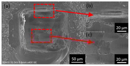 SEM photographs of the quartz samples after 50 laser pulses with the metal target: (a) the entire pattern; (b,c) zoomed view of the edge and the rear surface center region of the plate.