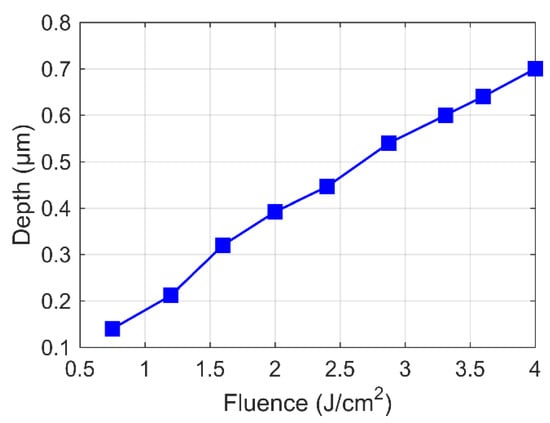Then, we varied the laser fluence from 0 to 4 J/cm2 and performed a single-pulse ablation series with the metal target to study the dependence of depth on the laser fluence. The resulting depths measured by the surface profiler are shown in Figure 4. When the fluence was lower than 0.7 J/cm2, no ablation occurred, since the laser irradiation fluence was lower than the damage threshold value. Afterward, the ablation depth increased linearly with increasing laser fluence.