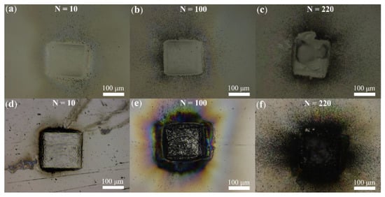 Photographs of the ablation patterns at 4 J/cm2 laser fluence with different pulse number N. (a–c) The rear surfaces of the fused quartz glass samples. (d–f) The top surfaces of the stainless-steel target.