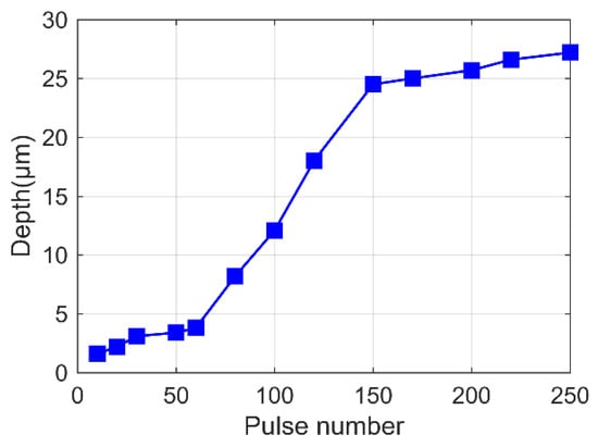 The ablation depth is shown as a function of the pulse number in Figure 6. The depth value increased with the number of pulses in each position. It can be observed that, when the number of pulses was less than 70, the laser ablation effect was very modest, and the depth was less than 3 μm. However, when the pulse number was greater than 70, the ablation depth significantly increased. Furthermore, when the number of pulses exceeded 130, the ablation depth increased more slowly with the number of pulses, and the ablation efficiency began to saturate.