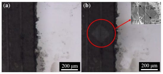 We planned to reapply the direct etching without the metal target with the etched quartz sample after LIPA processing instead of the bare one in Figure 3a, to check if the properties of the sample were changed during the etching. We firstly moved the stage to make a 600 × 1000 μm groove; then, in each node position, 150 laser pulses of LIPA with the metal target at 4 J/cm2 were performed, and the depth was measured to be around 24 μm, similar to that in Figure 6. Consequently, we removed the metal target and reapplied a secondary 20-pulse direct ablation onto the grooving area at the same quartz substrate height. Figure 7 shows the morphology of the sample prior to (a) and following the secondary direct ablation (b). Even without the metal target, the laser could still etch the quartz (in the red circle), which should result from an effect other than plasma etching.