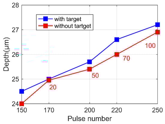 We performed a series of direct ablations without the target under different pulse numbers in the grove area, and the ablation depth values under 20, 50, 70, and 100 pulses are illustrated in Figure 8 (red). These depth values were found to be comparable with those from the previous ablation series with the metal target (blue) under pulse numbers from 150 to 250 in Figure 6. This result indicates again that, with large a pulse number (here, more than 150), the plasma ablation effect can be neglected, while another phenomenon contributes to the quartz etching.