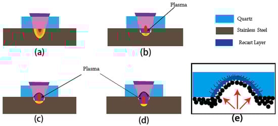 From the morphology result displayed in Figure 7 and Figure 8, there appears to be another ablation mechanism when the metal target is absent. After reviewing the literature [22,23], we propose a two-step ablation hypothesis during LIPA to describe the processing dynamics. A schematic of the process in our experiment is depicted in Figure 9.
