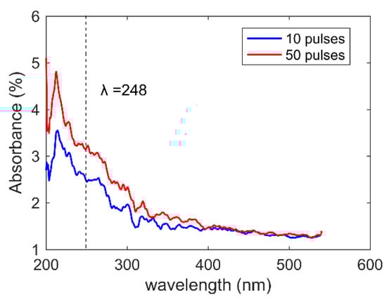 To validate our hypothesis of absorption enhancement resulting from the metal residuum, the absorption rates of the resulting quartz sample after the LIPA at 4 J/cm2 fluence were measured using a UV spectrometer (UH-4150, HITACHI Co., Ltd., Marunouchi, Tokyo, Japan). As shown in Figure 10, the absorption ecoefficiencies at 248 nm were measured to be 2.5% and 3.2% after exposure to 10 and 50 laser pulses, respectively. Nevertheless, the absorption rate of the bare quartz plate before exposure was measured to be less than 0.01%. The absorption rate increased by at least two orders of magnitude.