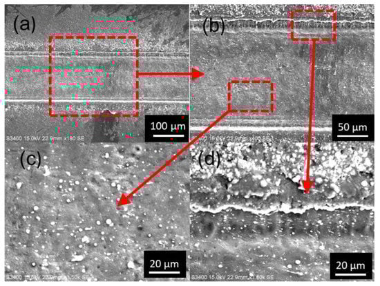 SEM photographs of LIPA-introduced fused quartz glass microchannels: (a,b) the entire channel; (c,d) zoomed view of the rear surface center and the edge.