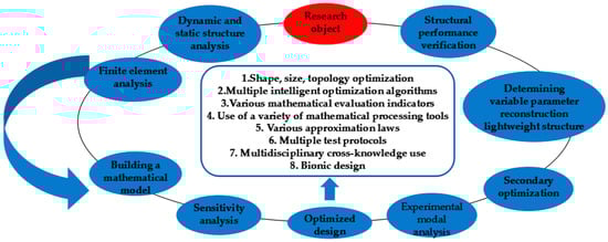 Increasing the payload and lightweight design of the aircraft structure, the integration of materials, structure, and manufacturing process is the eternal driving force to lead the optimization design theory and technology development. Therefore, according to lightweight design objects, such as automobiles, airplanes, folding electric vehicles, various beams, etc., under the condition of ensuring the basic performance of various lightweight objects, the quality can be reduced via the following ways (see the Figure 2).