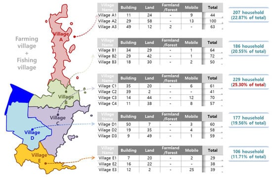 The target town, which was designed to secure 90% energy self-sufficiency by minimizing power usage and the number of sunless days, consisted of approximately 70% farming and 30% fishing households. Out of a total of 905 households, 207 were fishing, 346 were farming, and 352 were sustained by both farming and fishing. Figure 1 shows detailed information about the 905 target households, such as the method of classifying them into five villages. “Building” indicates the number of households in the villages that installed PVs on the rooftop or at the side of the residential building. “Land” indicates the number of households in the villages that installed PVs in their yard or at other sites near their house because the residential building was too fragile to install PVs on it. “Forest/Farmland” indicates the number of PVs installed in households that live off farming, for example, PVs installed in barns. “Mobile” indicates the number of PVs installed in a mobile rack or frame so that they could be moved to places that consume power occasionally, such as a greenhouse.