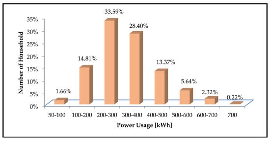 Table 2 and Figure 2 show the proportion of energy usage of the 905 target households. Out of the 905 households, 304 (33.59%) had an average energy usage between 200 and 300 kWh in 2017, which was the biggest portion of the whole samples. Households using less than 100 kWh accounted for only 1.66%, and those using over 700 kWh were only 0.22%, which made them the minority cases.