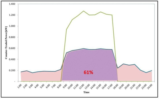 Figure 3 was made by overlapping the estimated solar power generated by 3-kW PVs in a day (green line), and the hourly power usage pattern of households using an average of 250 kWh in a month (blue line). The overlapped area (purple) indicates the counter-traded power to help illustrate how installing PVs could affect enhancing energy self-sufficiency. Counter-traded power is calculated by subtracting the power generated by PVs from the power consumed during the same time period. This way, users can see how much electricity charge could be saved by installing PVs. Assuming that households have the same power usage pattern, the hourly power usage patterns could be predicted for cases where PVs are not installed [20]. If the load pattern of the household can be altered so that more power usage could be placed within the generating time of the PVs, then the portion for counter-traded energy would rise by over 61%, as shown in Figure 3, resulting in improved economic feasibility. Therefore, in this work, counter-traded power was taken into account when selecting the adequate capacity of the ESS. Minimizing the capacity of the ESS is crucial for decreasing the initial construction costs and increasing economic feasibility. Modifying the daily load pattern of the households to be placed within the generation time of the PVs will result in a rise of counter-traded power to over 61%, and help with deciding the economically suitable capacities of the ESS.