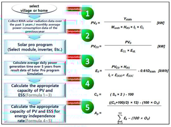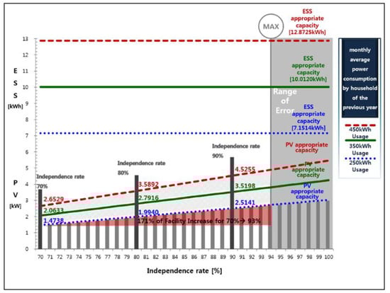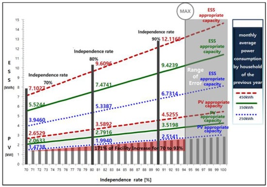 Under the national policy, the PVs capacity is generally set to either 3 kW or 5 kW, regardless of the power usage pattern of each household or town. If a PVs with a capacity of 5 kW generates for an average of 3.6 h per day for a month, the generated power would be 540 kWh. If a PVs with a capacity of 3 kW generates under the same condition, the generated power would be 324 kWh. In both cases, there are households that do not fit into the system. To reduce such problems and enhance the economic feasibility of the system, a case study of 905 households was done to design the proper method of deriving the optimum capacity of PVs and ESSs that is proportional to the scale of the energy self-sufficiency of 70–90%.