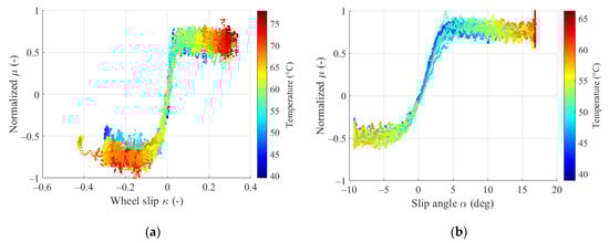 18] states that in racing applications, the temperature of the tread significantly affects both the tire stiffness and the contact patch friction. It should be noted that the effect on the friction is higher. Since the rubber viscoelastic properties depend on temperature, the maximum performance on the racetrack is only available in a specific temperature range.