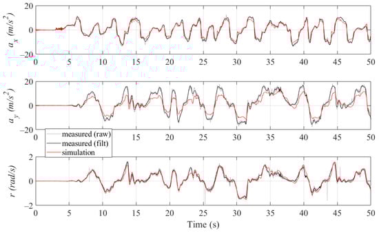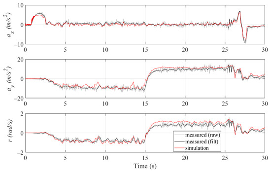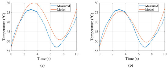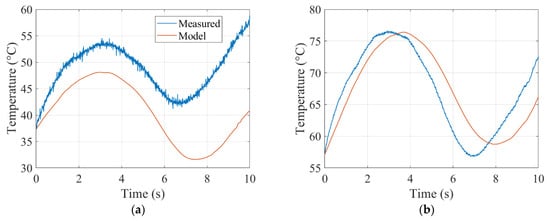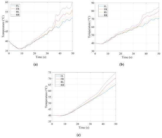 It was checked that the fitting parameters provide a good estimation for different maneuvers. For example, the parameters were first optimized for lateral tests and later checked again for acceleration/braking tests. Then an average was taken for the tuning parameters to cover all the experimental tests and represent the whole driving envelope. The comparisons between the measured temperature, the temperature obtained from the Kelly and Sharp model, and the proposed thermal model are shown in