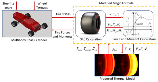 24] was used. The model was empirically tuned using experimental data to demonstrate the variation of tire performance as temperature function. The thermal model considers distinct thermal capacities related to the tread and carcass. The tread thermal capacity is related to the heat flux caused by the tire–road forces and carcass thermal capacity is affected by rolling resistance and exchanges heat with the external ambient. Other heat fluxes corresponded to the ambient and exchange between the two capacities. The original model [