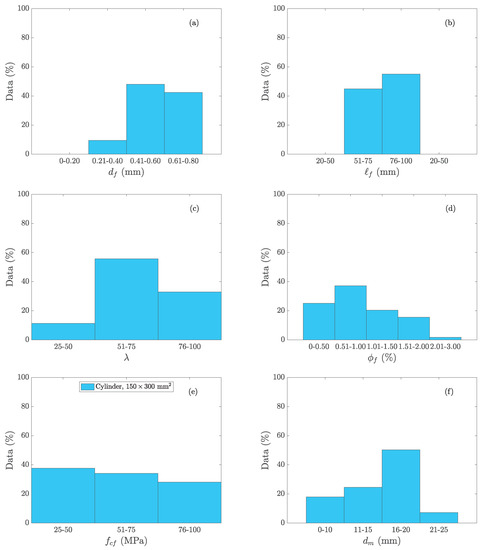 Distribution of the data of the principal factors included in the database: (a) diameter of steel-fiber, ; (b) fiber length, ; (c) fiber aspect ratio, ; (d) fiber content, ; (e) compressive strength of SFRC, ; and (f) maximum size of the coarse aggregate, .