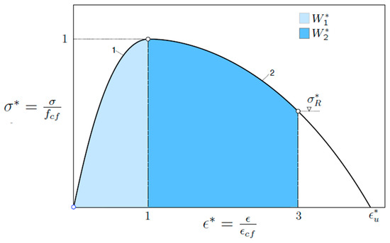 where is the area below the - curve between and , that is the deformation work per unit volume consumed by the specimen from the peak of the curve to a strain three times larger than that of the peak. () is represented as the dark blue area in Figure 2. The reason for choosing as a reference is due to the fact that in all the tests included in the database that present diagrams of the - curves, at least this value is achieved; in other words, these specimens deformed and consumed energy up to at least. The softening curve in Equation (7) is on the safe side since the majority of the curves collected are capable of consuming more energy than that proposed in the model. In addition, is always less than the unit in such a way that the model does not take into consideration the possibility of having hardening due to compression deformation. In the case of seeking to consider it, the parabola could be replaced by a straight horizontal line (), limiting the ultimate strain value, .