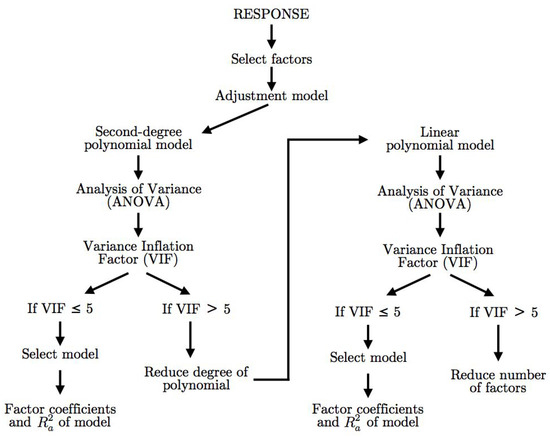 Therefore, the analysis of the responses has been performed exclusively with first degree models (Equation (9)). After verifying that the linear models correctly predicted the responses in the domain of the definition of factors, the study of the VIF revealed that they were greater than 10 in the majority of factors, except for and , for which VIF ≃ 1. This fact demonstrated that multicollinearity still existed, for which reason it would be appropriate to make a selection and reduce the number of factors with which the responses are analyzed.
