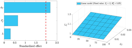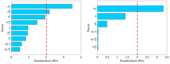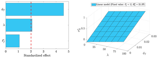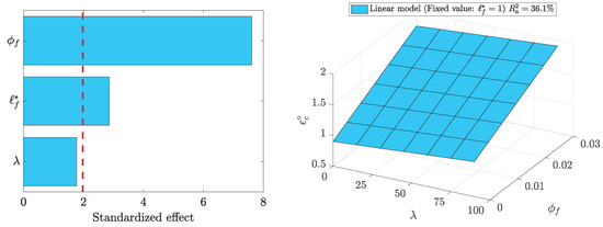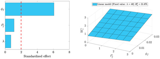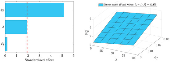 From the linear adjustment and the statistical analysis of the relationships between the defined variables, the coefficients of the model were calculated. They are included in Table 5. Figure 6, Figure 7, Figure 8 and Figure 9 represent the Pareto diagrams for the , , , and responses, as well as the adjustment diagrams of their response surfaces with respect to the statistically significant factors.